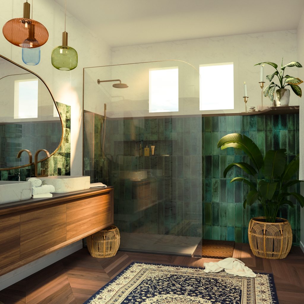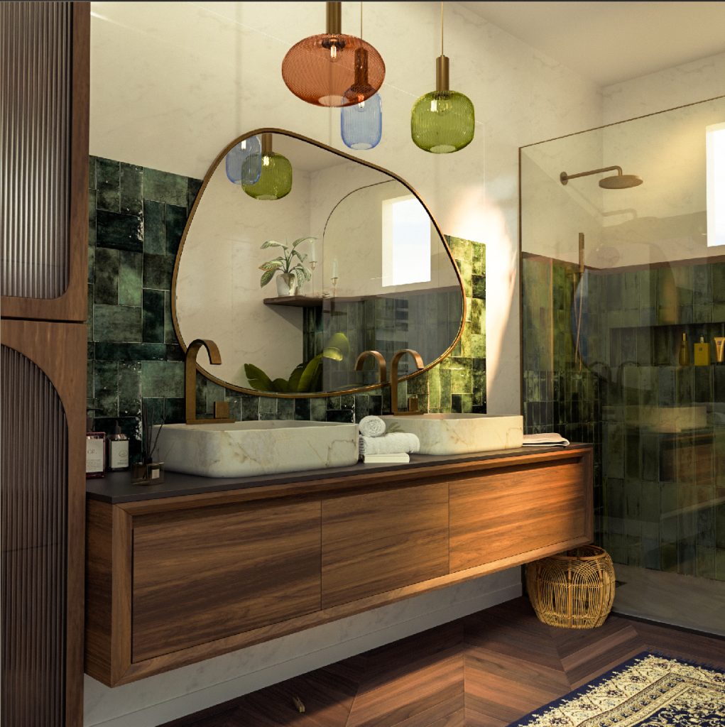 Ce projet s’inscrit dans une interprétation contemporaine du Mid-Century Modern, enrichie d’influences tropicales et artisanales, pour créer une salle de bain pensée comme un espace de retraite sensorielle.